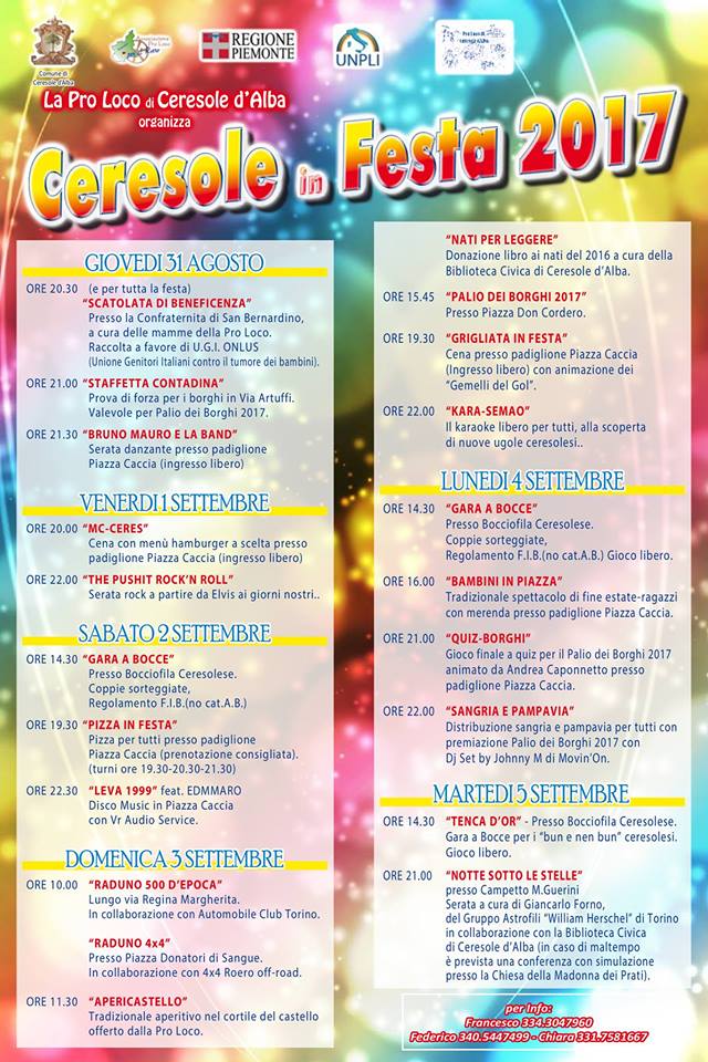 CERESOLE D’ALBA – Per sei giorni, da giovedì 31 agosto a martedì 5 settembre 2017, torna”Ceresole in festa”.
