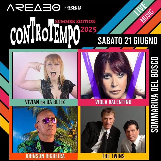 Sabato 21 giugno Area30 propone a Sommariva del Bosco una serata di musica live dedicata agli anni 70-80-90 con l’edizione 2025 del “Controtempo Summer Festival”: tra gli ospiti Viola Valentino e Johnson Righeira.