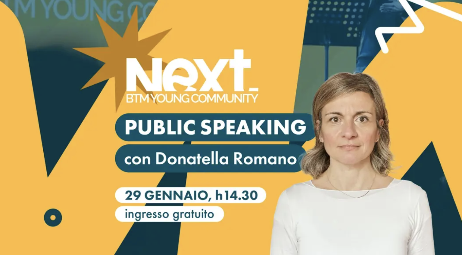 Giovedì 29 gennaio è in programma il secondo appuntamento di Next BTM dedicato ai giovani che vogliono affinare le tecniche di public speaking con Donatella Romano.