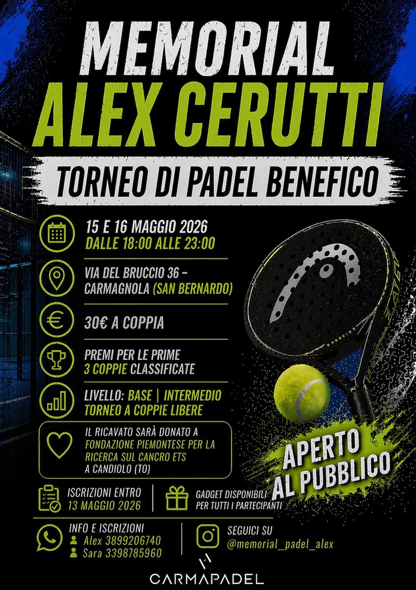 Il 15 e 16 maggio 2026 è in programma a Carmagnola la prima edizione del Memorial Alex Cerutti, torneo benefico di padel organizzato da amici e familiari per ricordare un ragazzo scomparso nel 2024 a causa di un tumore ma che ha lasciato un segno profondo in chi lo ha conosciuto.