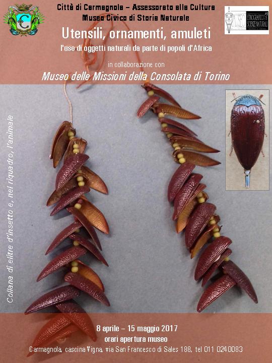 Dall’8 aprile fino al 15 maggio 2017, il Museo Civico di Storia Naturale di Carmagnola organizza una mostra dedicata ad oggetti africani, realizzati con materiali naturali e inconsueti sia per noi europei sia per molte delle attuali popolazioni africane.